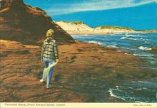 Colour photograph of a person standing on the rocky shore at Cavendish.
