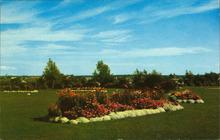 Colour photograph showing a number of flower gardens within Elizabeth Park in Summerside.