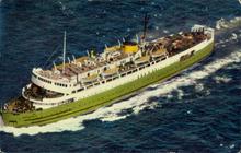 A colour photograph of the aerial view of a car ferry sailing at sea.