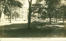 A black and white photograph of Queen Square in Charlottetown showing Province House.