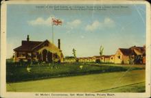 A hand coloured image of the frontal view of a resort with different cabins and cottages in the background, with a flag and street in front.