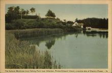 A hand coloured image of the view of a fishing pond with reeds and small building in the background. Published by The Photogelatine Engraving Co., Ltd. Made in Toronto, Canada.