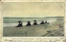 A hand coloured image of people on the beach with the water in the background. Published by Photogelatine Engraving Co., Limited. Made in Ottawa, Canada.