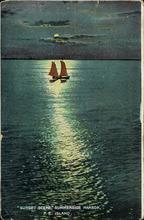 A sepia image of a person in a sailboat sailing across the Harbour, the image is in a frame with maple leafs and the British flag on the sides. Publisher or Country of Origin not known.