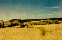 A mirro-krome card of a farm with a farmer, some animals and more farmland in the background. Photo Courtesy of P.E.I. Tourist Bureau. Mirro-krome card by H.S. Crocker Co., Inc. Published by H.H. Marshall Ltd. Made in Charlottetown, P.E.I., Canada.