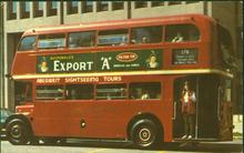 A colour image of a double decker bus with passengers seated inside. Publisher not known. Made in Canada.