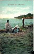 A sepia image of 4 children and a dog in the Water at the base of Cliffs with a sailboat in the background. Publisher or Country of Origin not known.