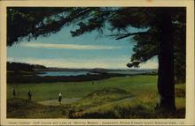 A hand coloured image of the scenic view of Green Gables Golf Course and Lake of Shining Waters in the background with people playing golf.
