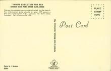 A plastichrome image of a lodge, cottages and trees in the background, and farmland in the foreground. Plastichrome by Colourpicture. Published by Island Wholesale. Made in Charlottetown, P.E.I., Canada.